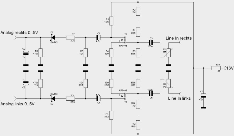 Mit den Stellwiderständen kann später der Pegel justiert werden. Wenn die Stellwiderstände in ihren Werten verkleinert werden, ergibt sich eine feinere Regelung. Allerdings wird dann der Eingangswiderstand kleiner... Ich habe es mit 1M aufgebaut, wenn ich es noch einmal machen wurde, wären 470k meine Wahl.