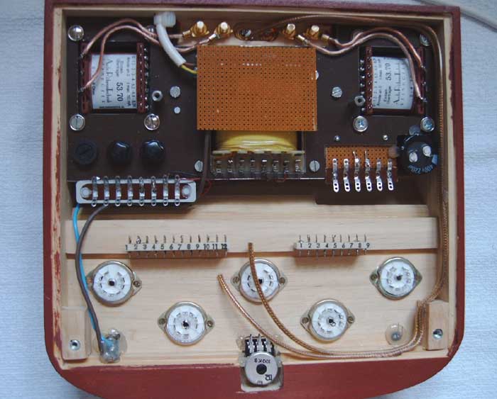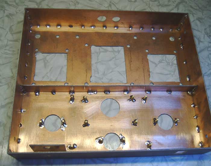die Kupferfläche ermöglicht eine gute Schirmung. Zur Befestigung der Röhrensockel und Lötleisten dienen