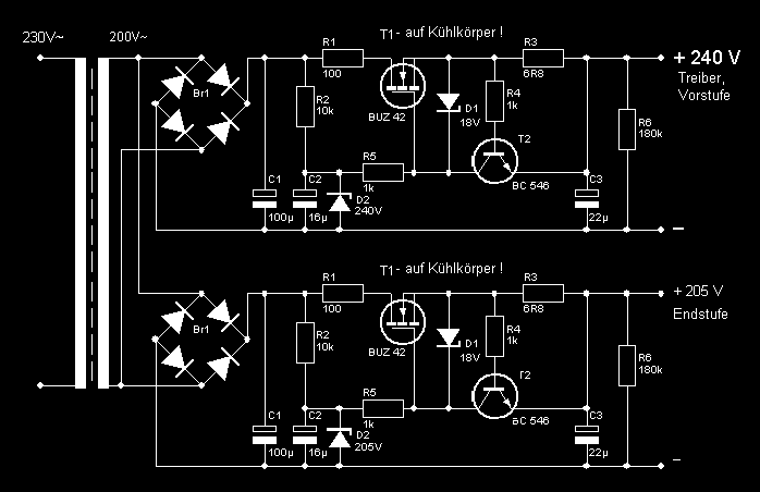 zweimal 46 mA plus zweimal 3 mA für die Vorröhren, eine Gleichspannung von 251 V liefern können.
