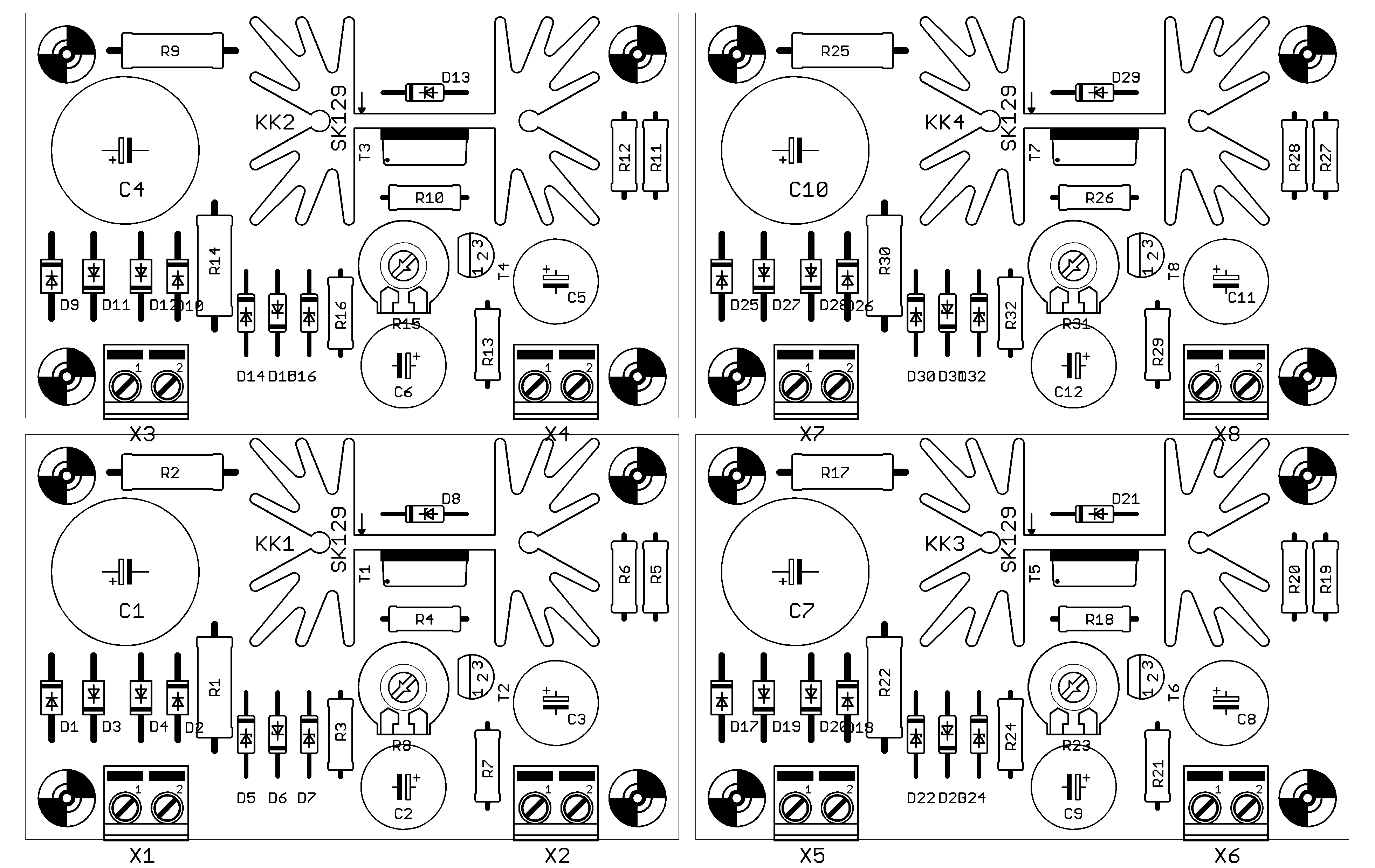 Für einen Stereoamp braucht man exakt diese 4 Stück. Das beigefügte Layout ist also so zu skalieren und