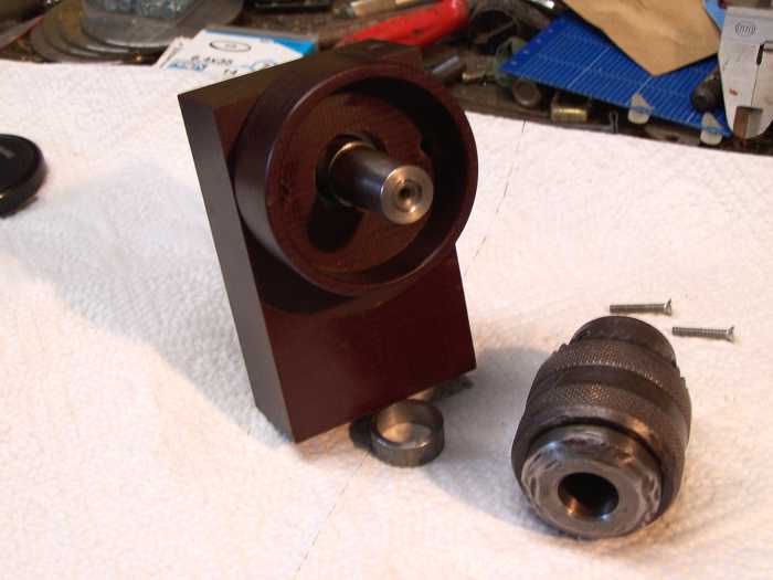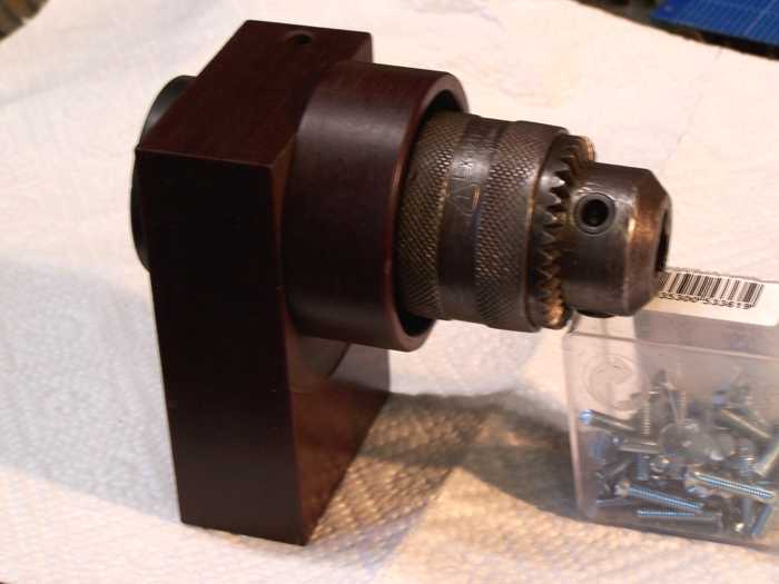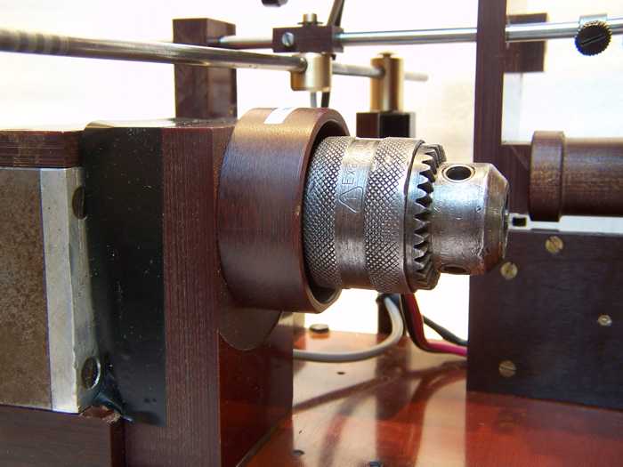 Der Antrieb: Ein ordentliches Bohrfutter mit Faden- und Fusselschutz. Das schwarze Klebeband war ein Provisorium