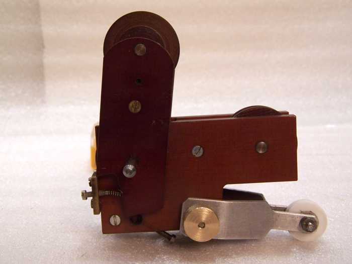 Die Drahtführungsmechanik zusammengesetzt von links. Der obere Rollenhalter ist um die Achse schwenkbar, um