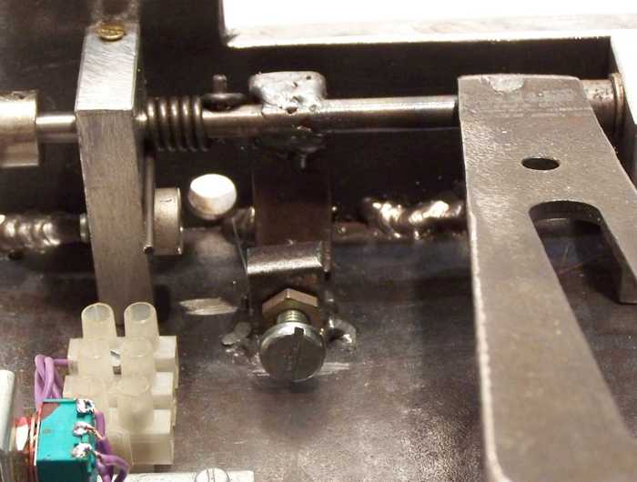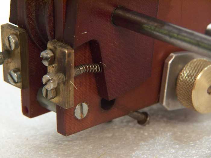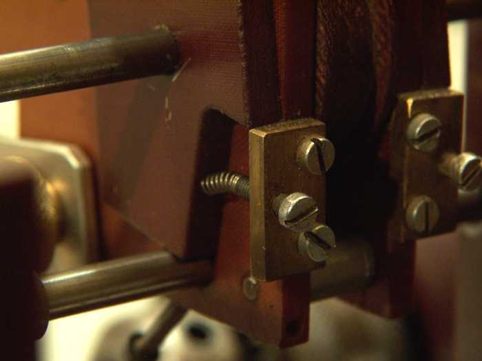 Details zur Mechanik: Der Lagerbock hinten (Betätigungshebel geklemmt) Der Klemmblock an der Schubstange (Pertinax)