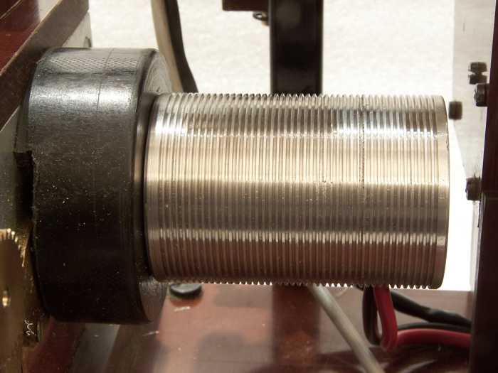 Detail der Kraftübertragung. Die linke Mutter ist auf der Wickelachse angeschweißt (vorher Achse und Mutter gut