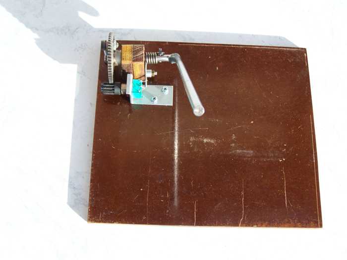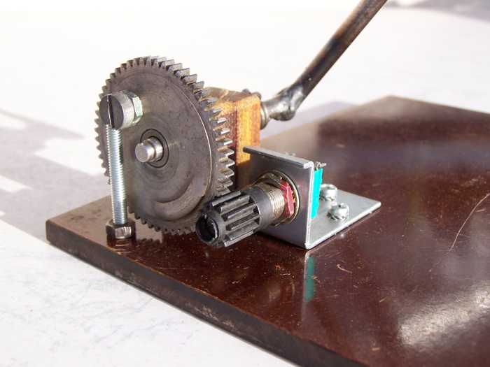 Details zum Handregler. Zahnräder und Welle aus der Bastelkiste, Hebel angeschweißt. Mit dem Exenterteil an der