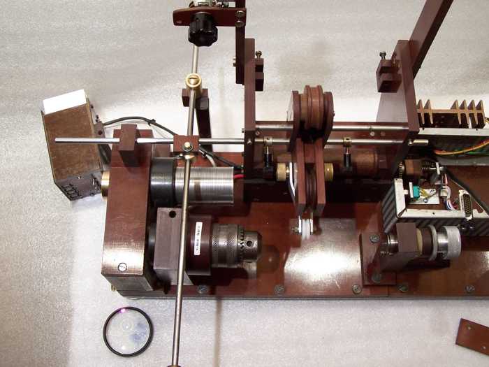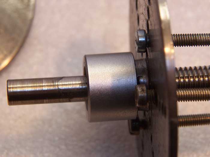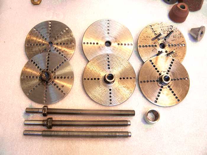 Die Aufnahme der Wickelkörper. Gut zu sehen: Die beiden Planscheiben (6er Teilung) mit eingedrehten Schrauben (und