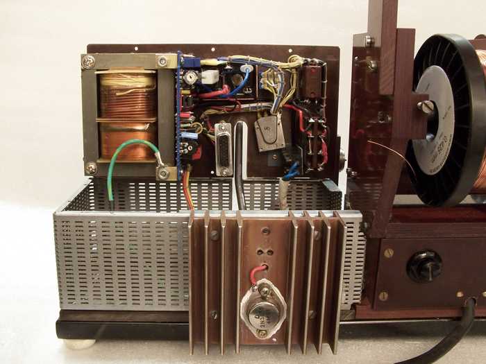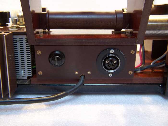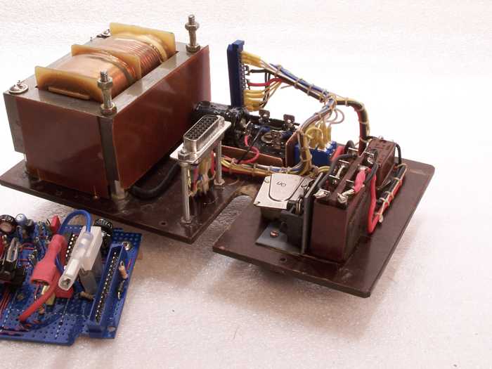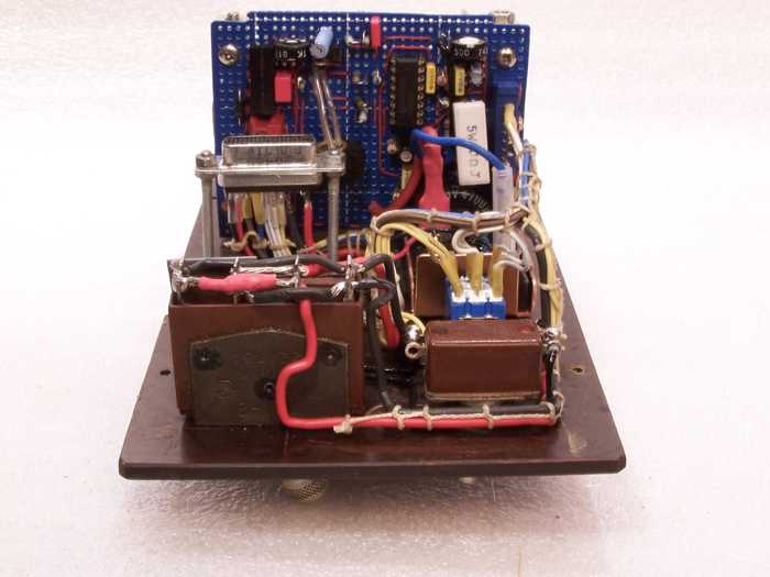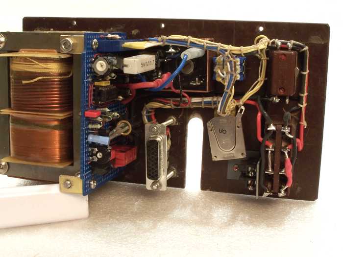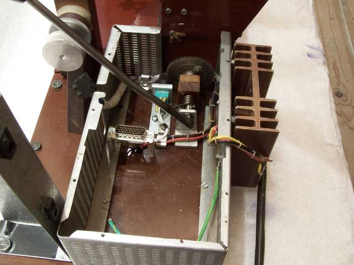 Blick in das Steuergehäuse: In der Mitte der Sub-D-Stecker, links das Netzkabel, rechts das Transistoranschlusskabel,