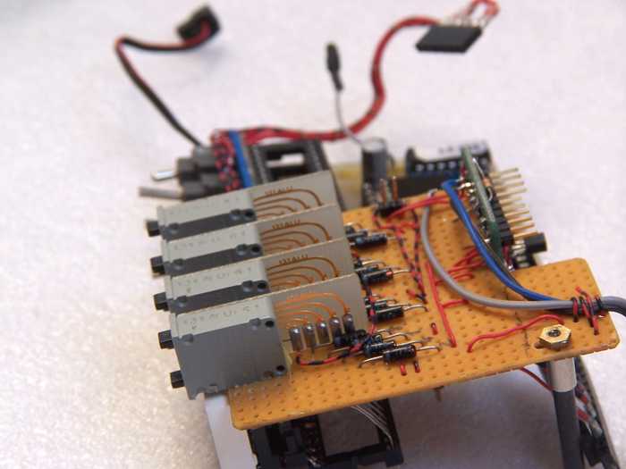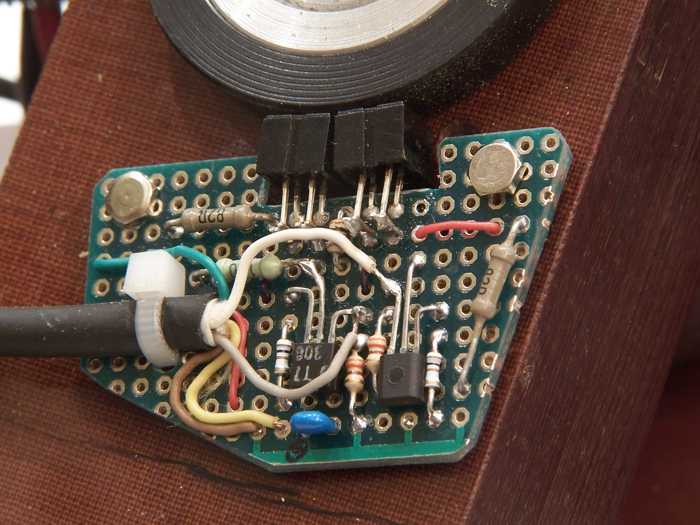 Die Optokoppler (Reflexkoppler) mit ihren Bauelementen. Die merkwürdige Form der Platine war nötig, da am Getriebe