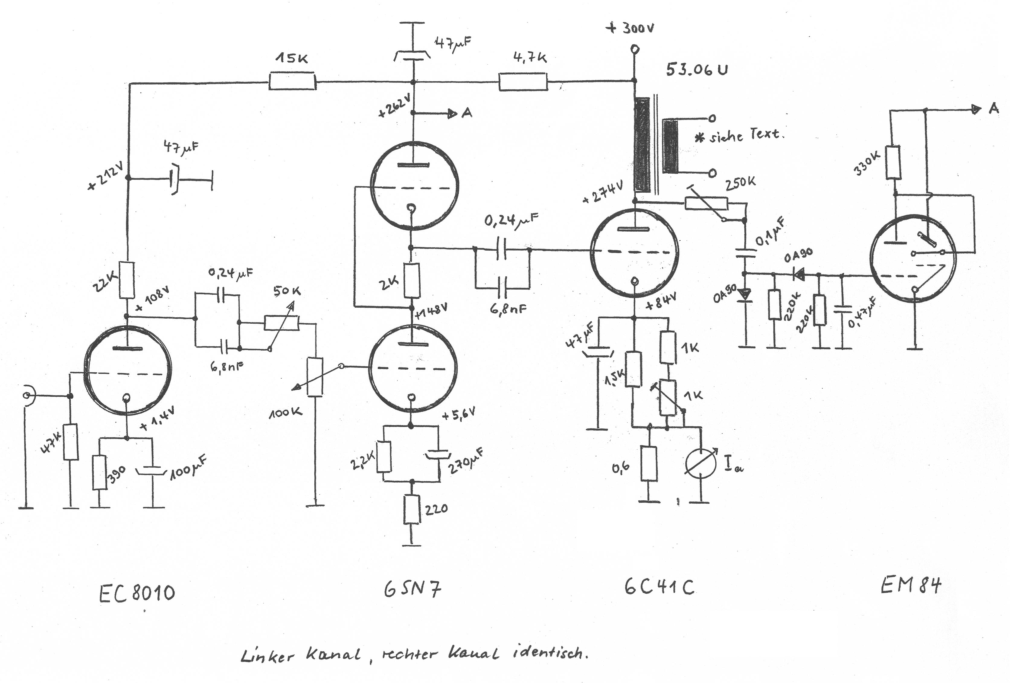(Leider habe ich vergessen, den Gitterableitwiderstand mit einzuzeichnen. Der Ableitwiderstand hat 470 kOhm.