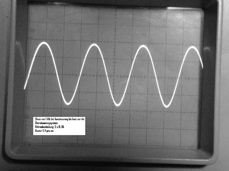 Der Verstärker leistet mit EL36 in der Endstufe 2 x 5 Watt bei Ub 375V. Das sind dann an der Anode 360V, Uk ca. 50V und