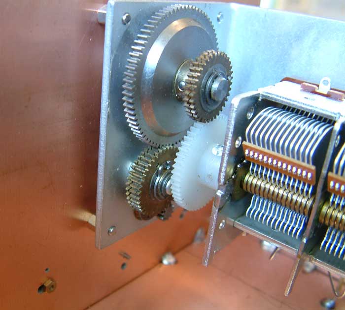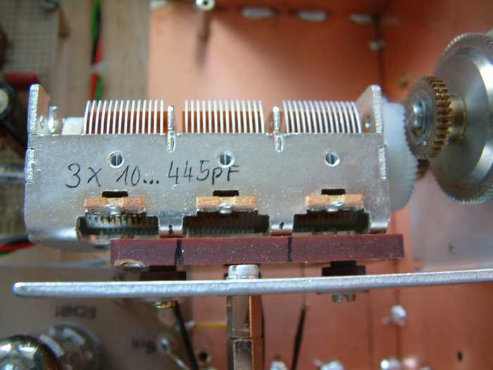 Zahnradgetriebe auf eine 180-Grad Drehbewegung für den Dreifach-Drehkondensator umgesetz.