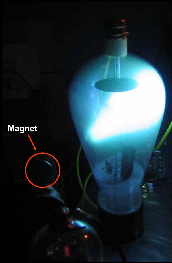 Verformung der blau leuchtenden Gaszone im Taylor 249 Quecksilberdampfgleichrichter durch ein