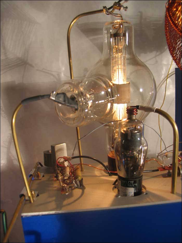 Der Quecksilberdampfgleichrichter E-M 15 gezündet. Links oben ist auch die