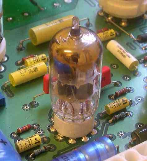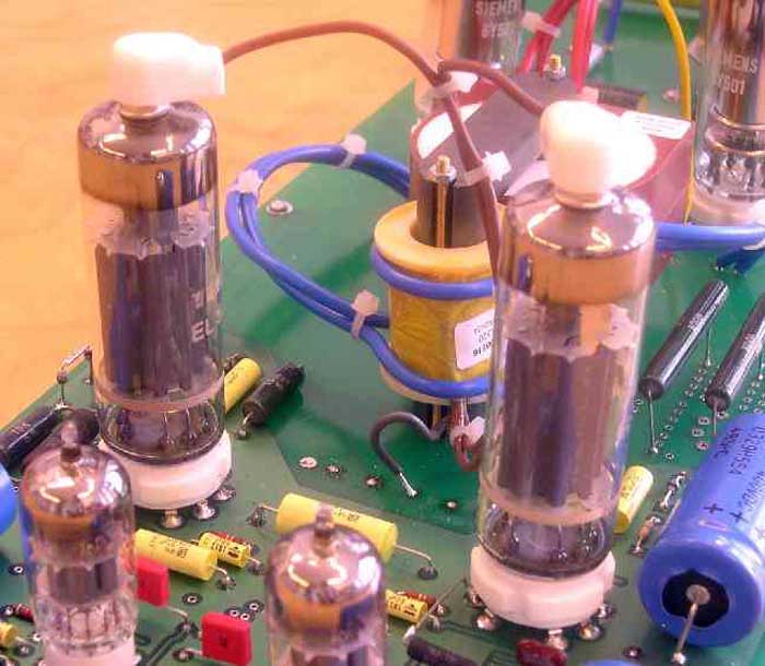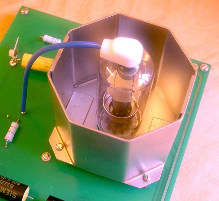 Deutlich kann man auf dem folgenden Bild die glühende Anode der ED500 sehen, es wird von 15kV Rohspannung auf 7,5kV