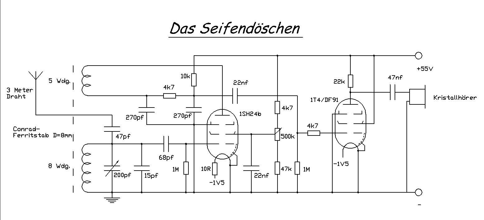Zwei Röhren wollte ich da doch schon haben, also nahm ich eine 1SH24b als Audionstufe und eine 1T4 als NF- Stufe