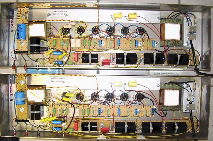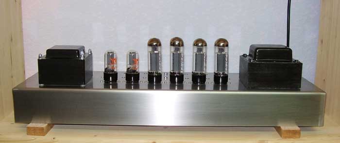 Vorstufe und Phasensplitter sind mit 2 x 6SN7 realisiert. In der Endstufe 4xEL 34 pro Kanal in Class A Betrieb mit Autobias