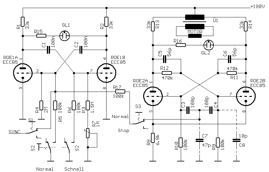 Der rechte Schaltungsteil zeigt das Flipflop. Die beiden Zweige des Flipflops bekommen ihre Anodenspannung über den