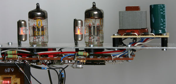 Anodenspannungsgleichrichters und der Siebschaltung (2 mal 47 µF und 100 Ohm) angeordnet. Die Drähte nach unten