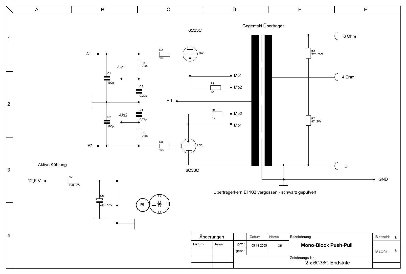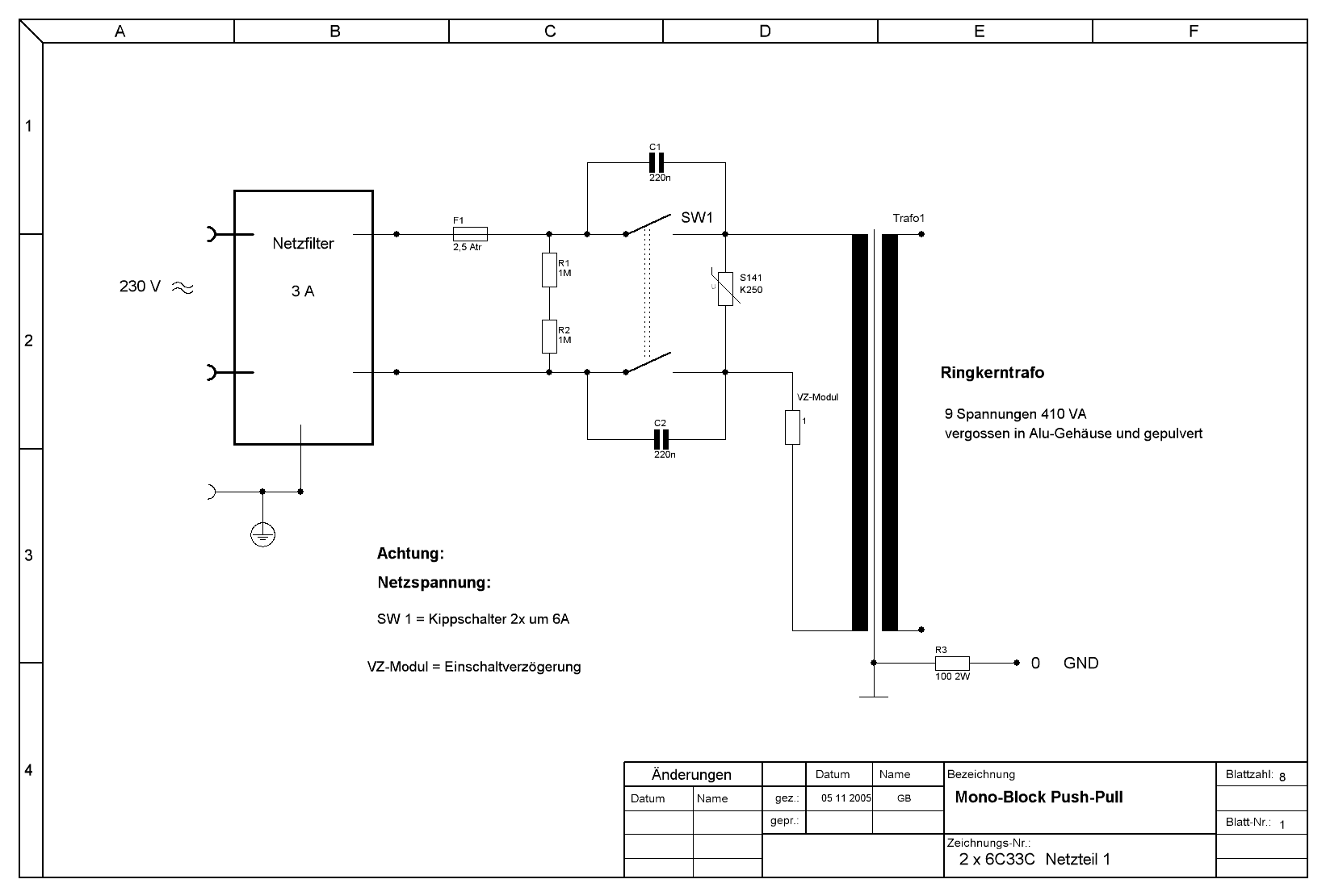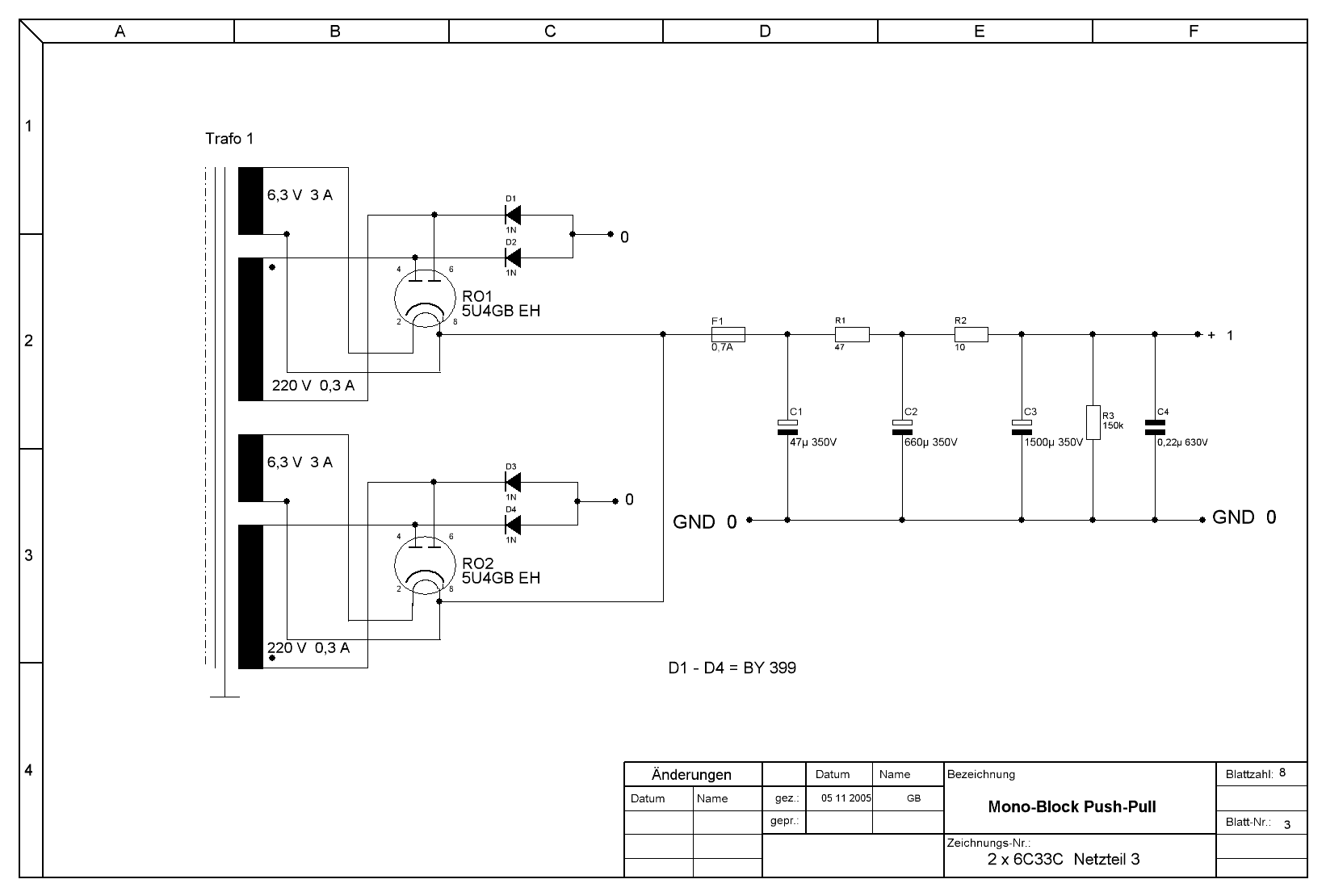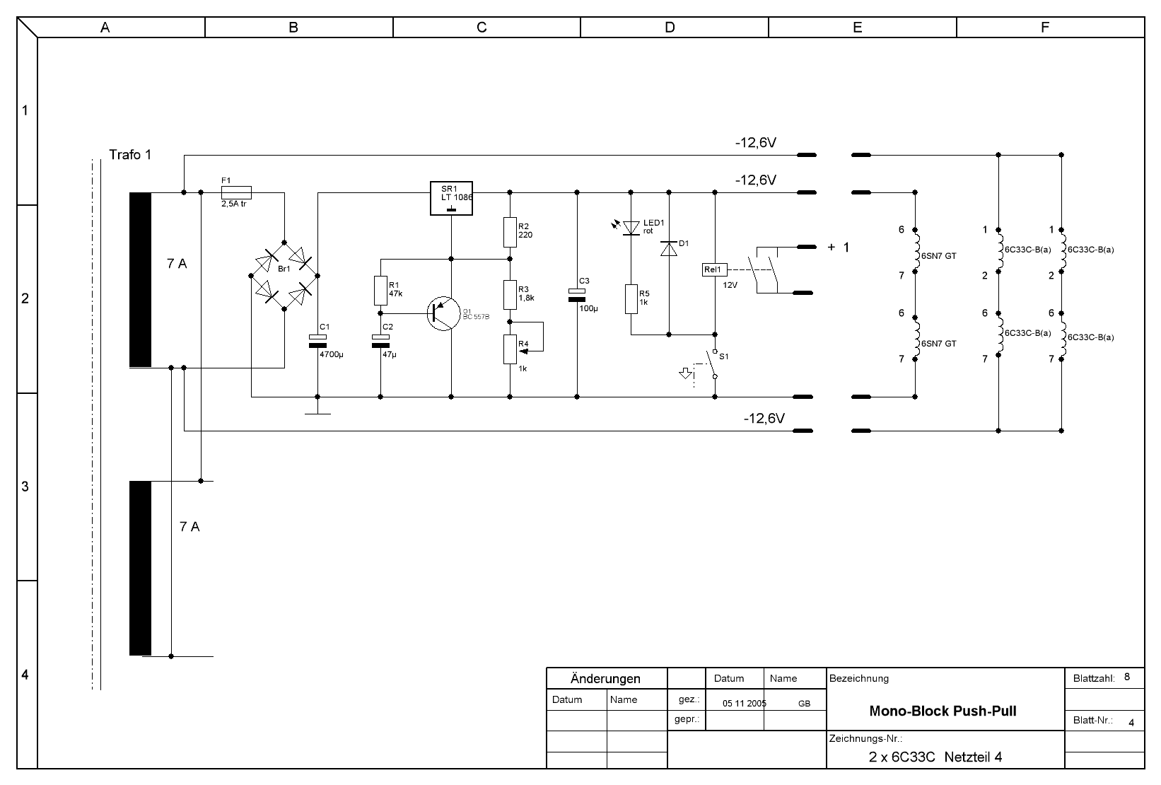 Die Heizwicklungen für die 6C33 sind auf dem Trafo getrennt gewickelt. Es werden pro Kanal 7A 12,6V bereit gestellt.
