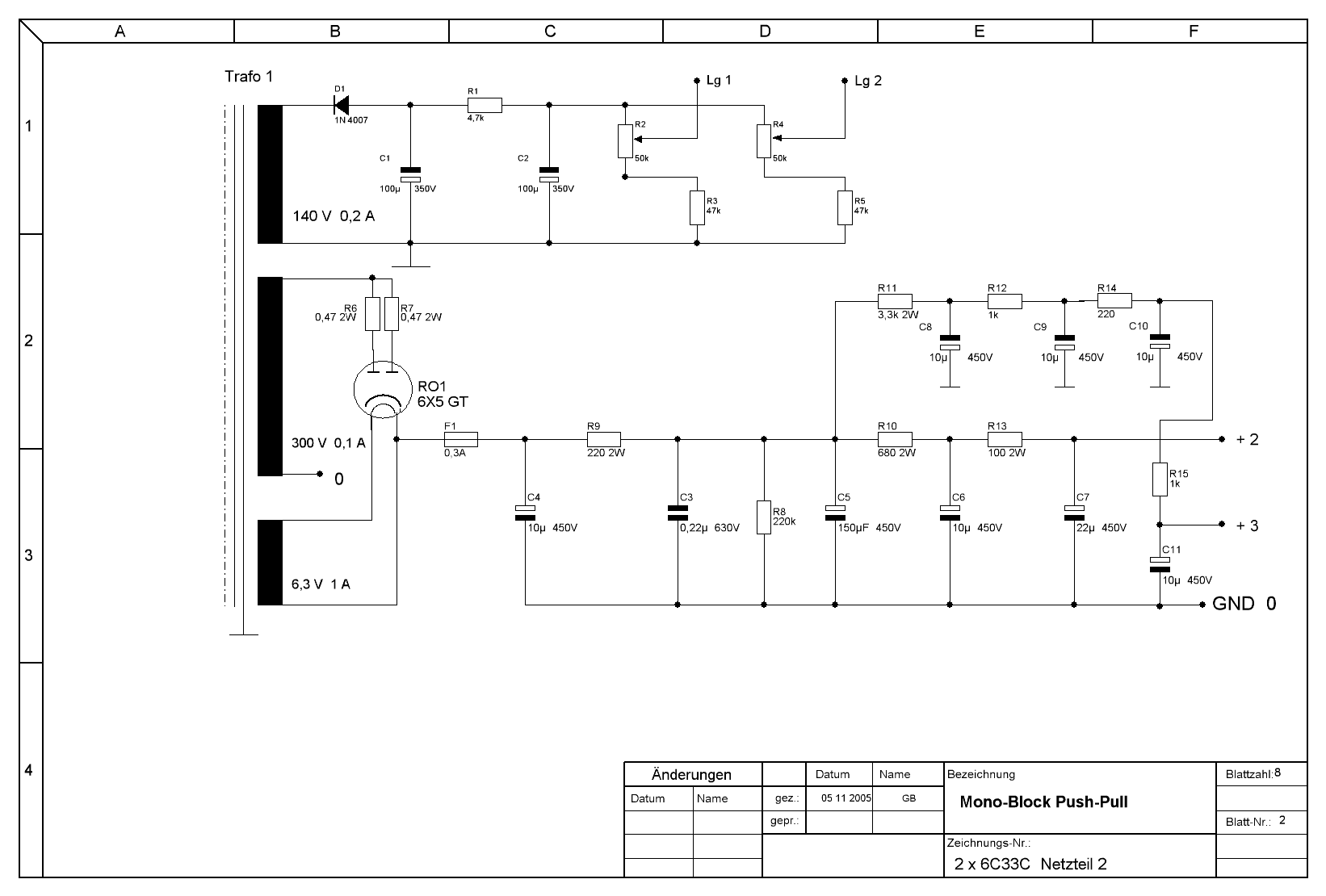 der AÜ die Anodenspannung für die Endröhren. R6 und R7 am Ausgang des AÜ schaffen Ruhe. Der AÜ ist