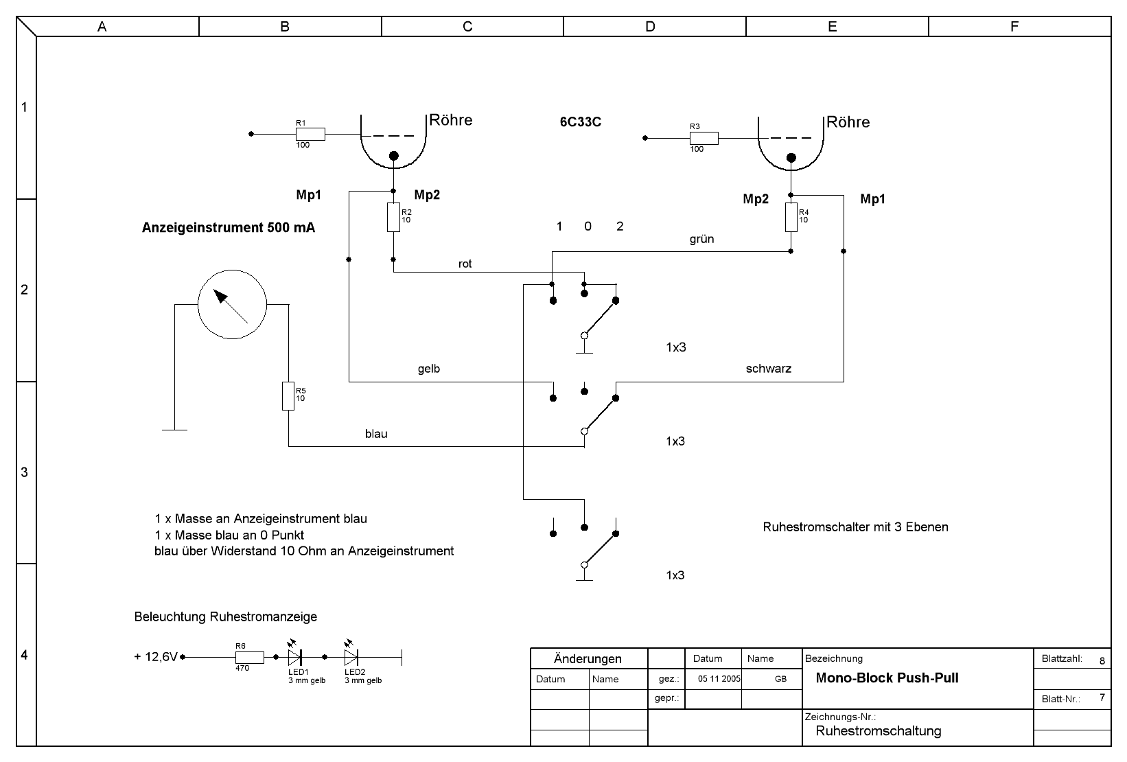 Der an den Kathoden der Endröhren liegende Schalter hat 3-Schaltstellungen und 4 Kontakte. Der Ruhestrom wird über