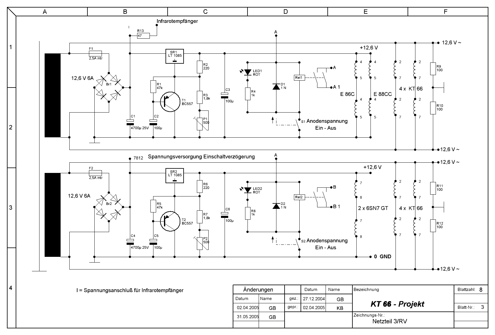 obiges Schaltbild, Netzteil Blatt 1) Hochspannungswicklungen von je 340/380V 0,4A sind für die Betriebsspannung der