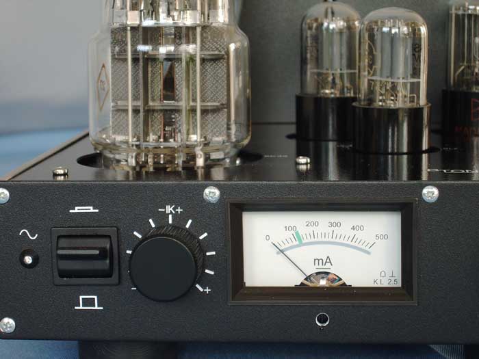 Der eingestellte Ruhestrom wird mit einem Drehspulen-Einbauinstrument 500mA / 1 W angezeigt. Die