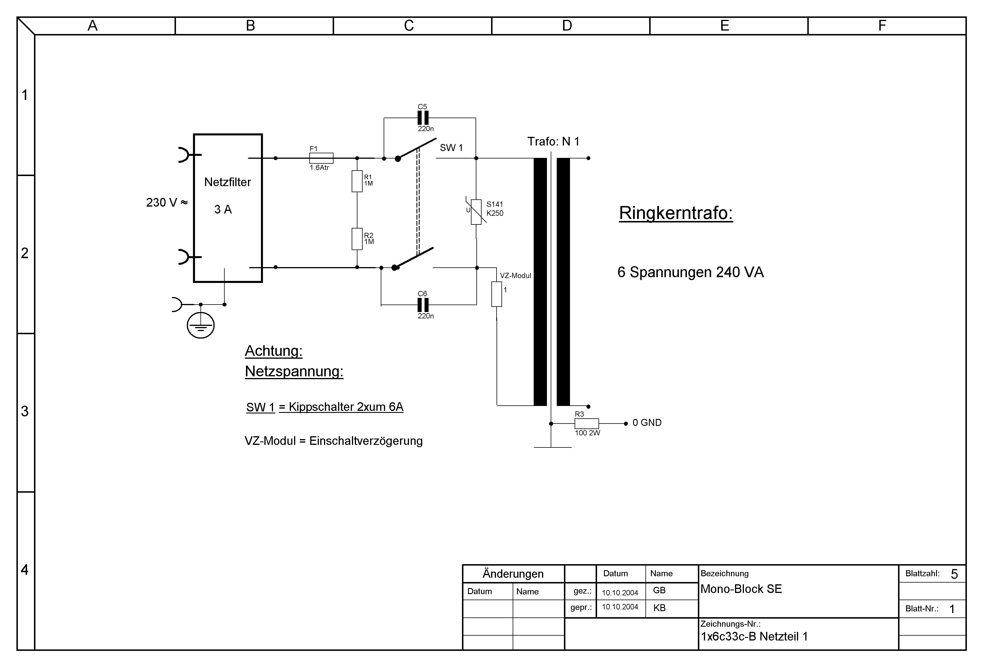 Betriebsspannungen unterteilt. Über ein Netzfilter wird die Netzspannung zu einen Kippschalter 2xVM 6A geleitet, da der