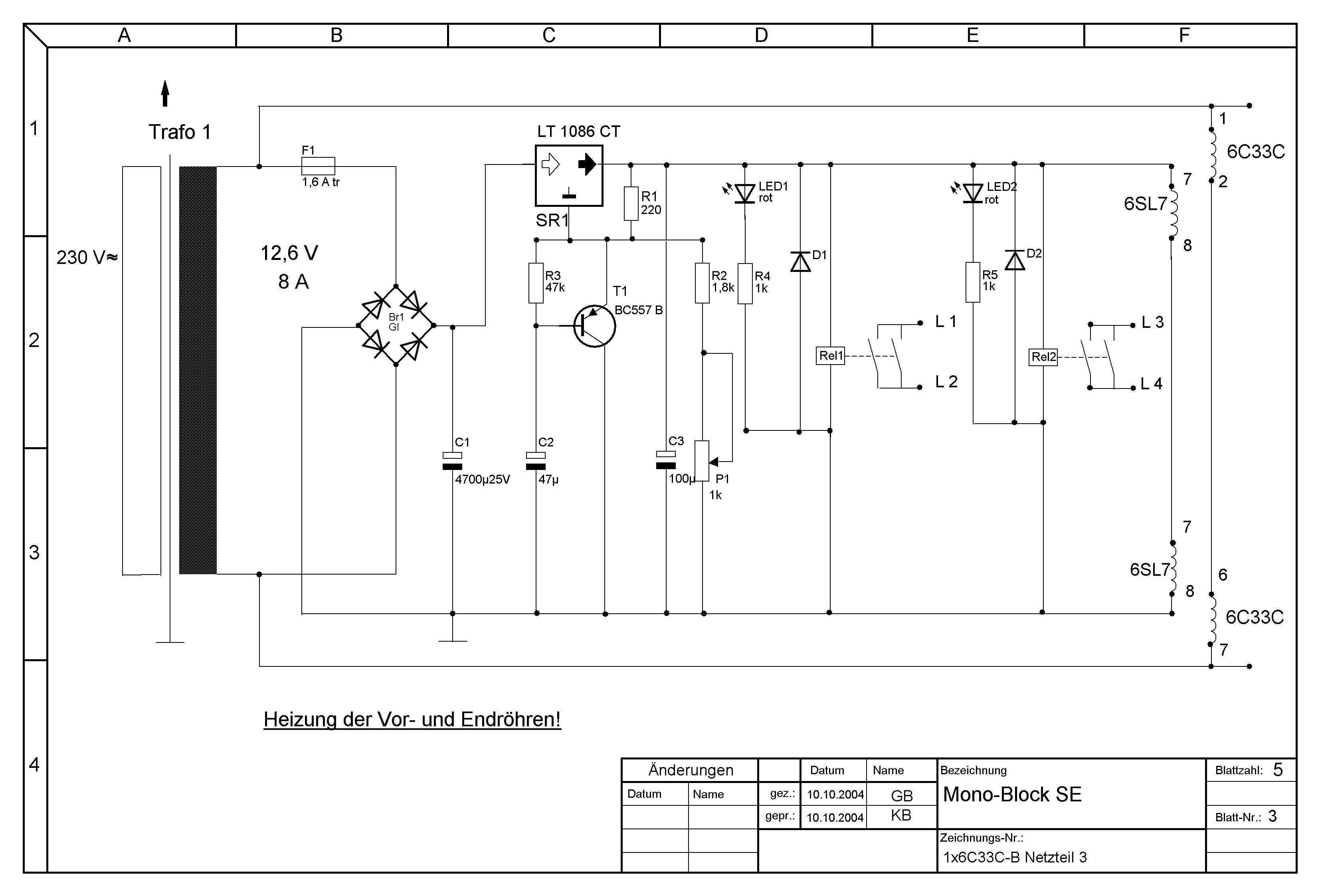Die Wicklung 12,6V 8A dient zum heizen der 6C33 und über die Sicherung 1,6tr werden die Vorröhren über den
