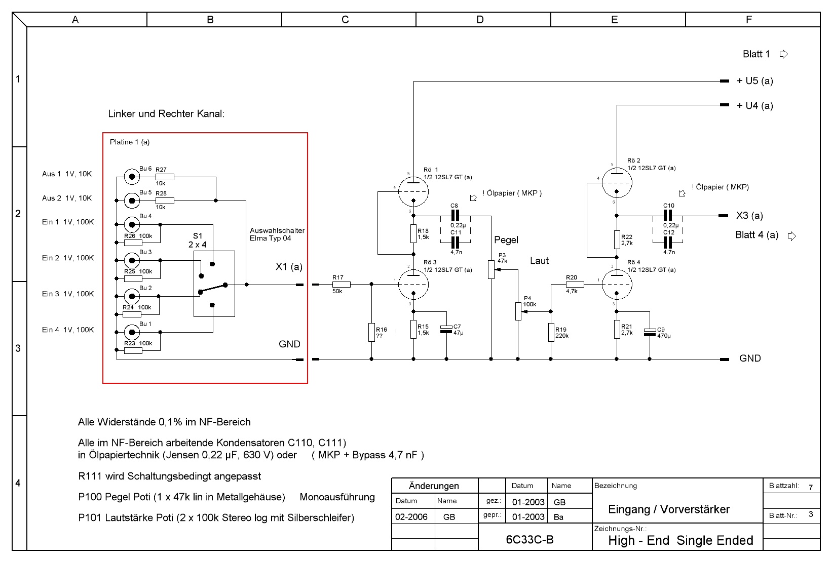 Die Eingangsröhren sind in SRPP geschaltet und gleichspannungsbeheizt. Die Kathode ist mit 47µF entkoppelt. Koppel-Cs