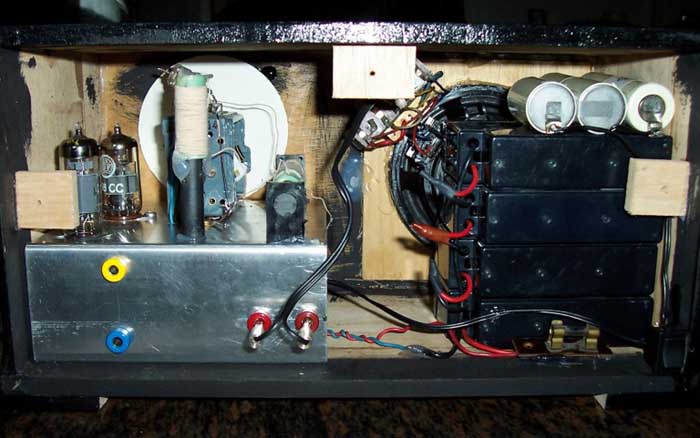Hier nochmal die Einsicht von hinten.....rechts die Akkus, 4 X 12 Volt für 48 Volt Anodenspannung, darauf der Heizakku