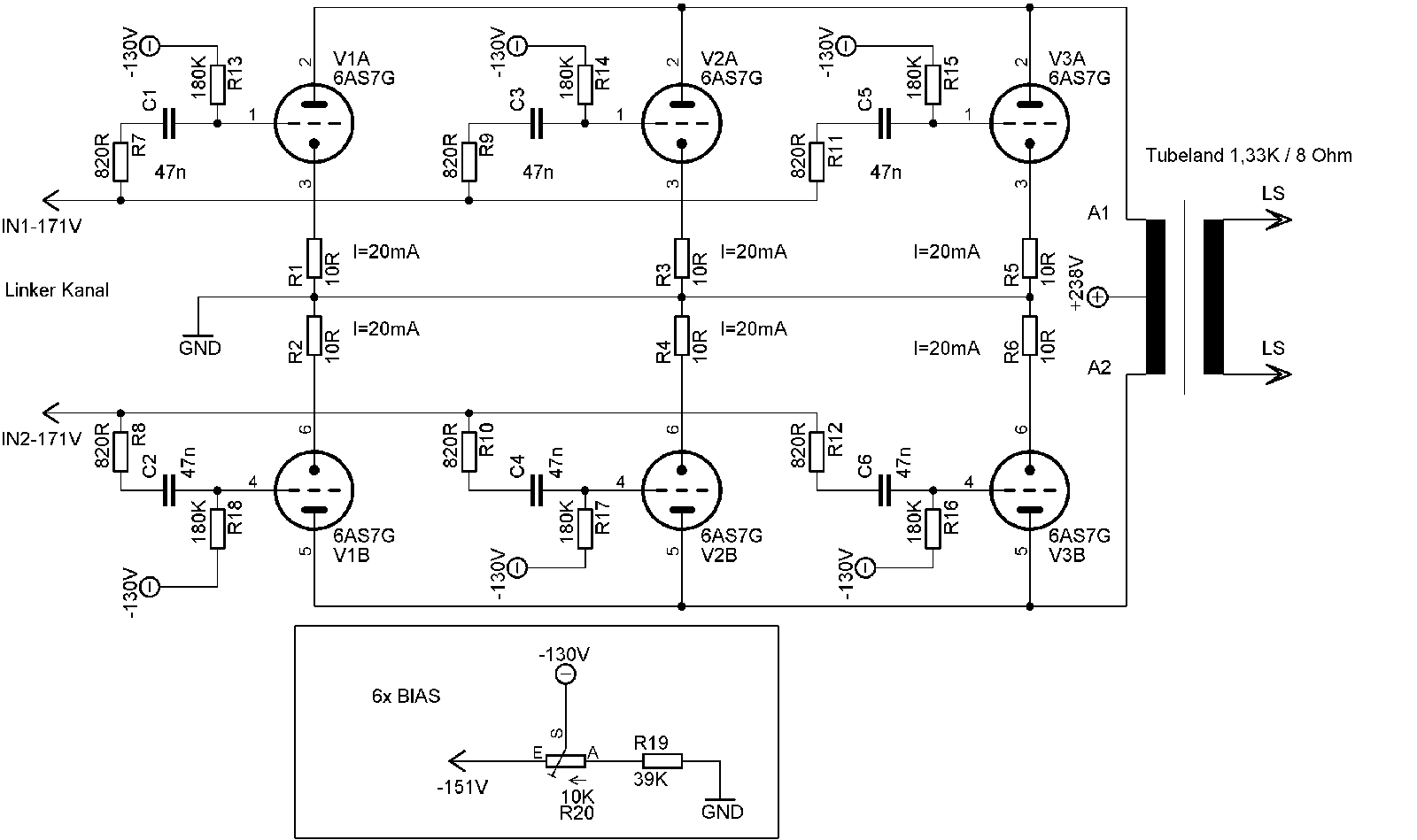 Ich habe auf Empfehlung von Kay, der auch mit der Röhre 6as7 gebaut hat, probeweiser einmal 100k statt 180k eingesetzt.