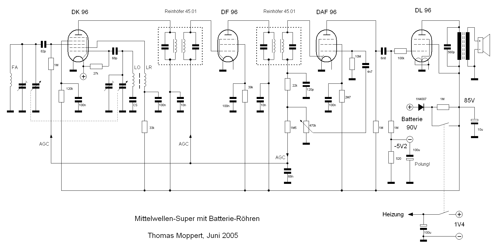 Masse geführt wird. Das Gerät zieht bei 90 Volt Batteriespannung etwa 10 mA. Damit fallen an besagtem Widerstand