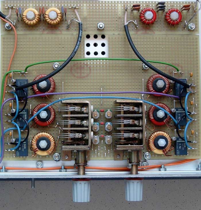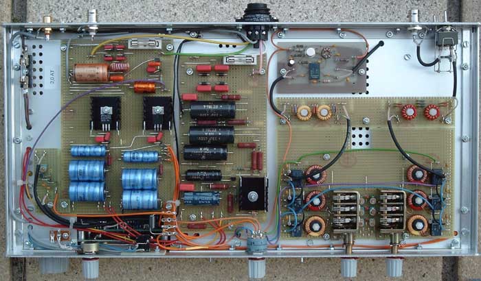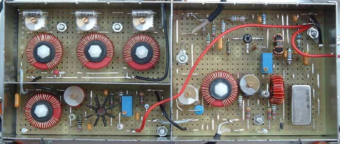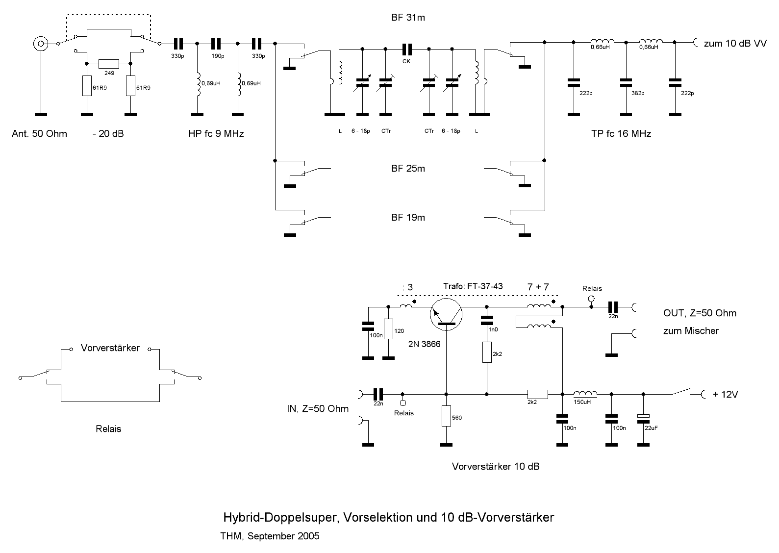 Vor den einzelnen Bandfiltern liegt ein Tschebyscheff-Hochpass mit einer Grenzfrequenz von 9 MHz. Danach folgen die drei