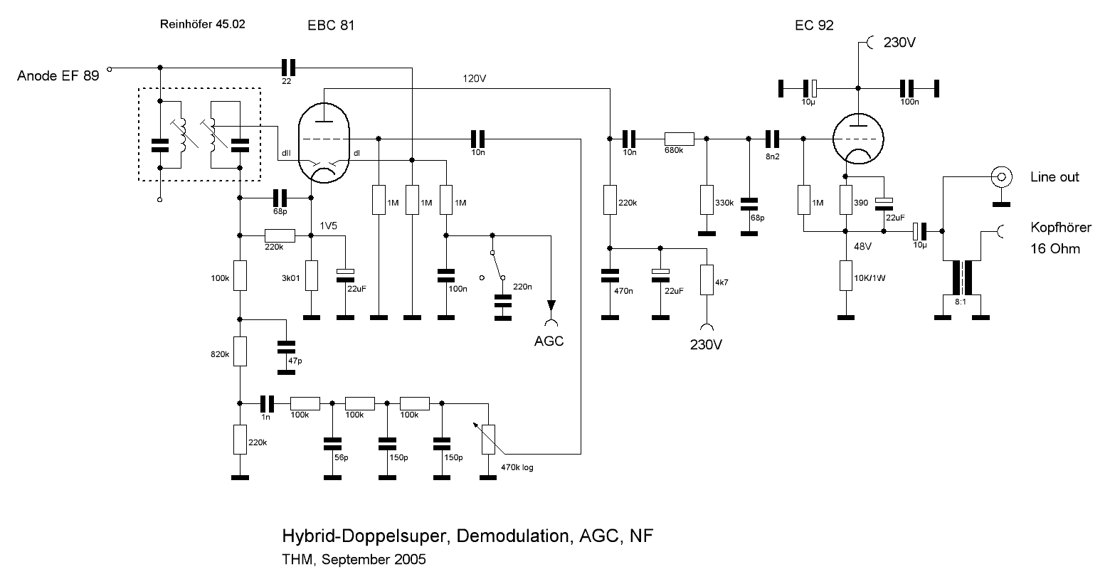 Diese Stufe mit der EBC 81 zeigt keine Besonderheiten. Die Regelspannung wird, wie gesagt, mit Verzögerung erzeugt,