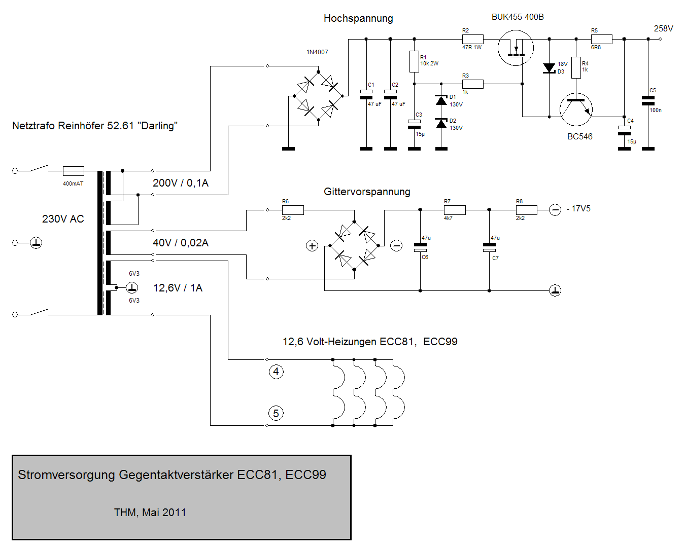 Die negative Gittervorspannung wird mehrfach gesiebt. Widerstand R6 bildet als Strombegrenzer die Lebensversicherung der 40-Volt Wicklung.