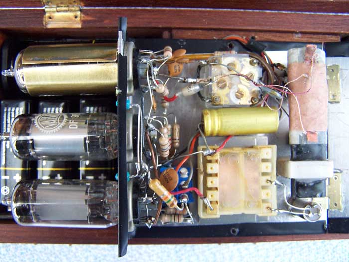 Unter dem Klappdeckel befinden sich die Halter für Heiz- und Anodenbatterien. Im "Sarg" liegt eine kleine