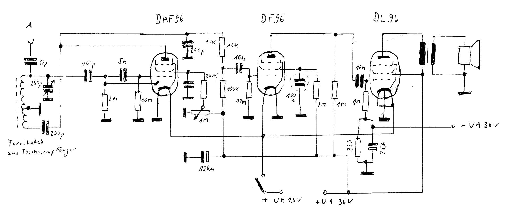 Die Röhrenbestückung besteht aus den bekannten Batterieröhren DAF 96 , DF 96 und DL 96.