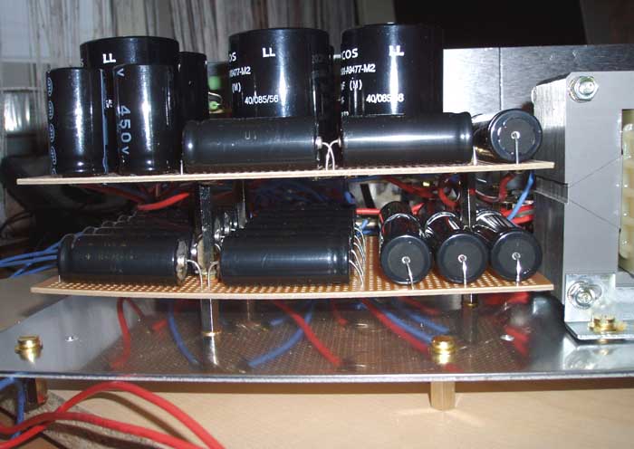 Die Kondensatoren für das Netzteil wurden auf Lochrasterplatinen gesetzt, die Widerstände auf Lötleisten,