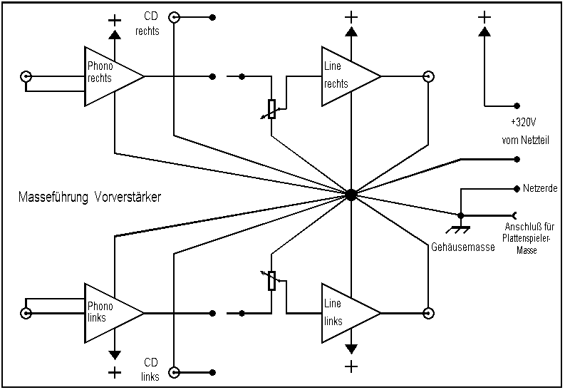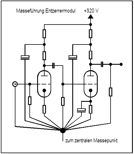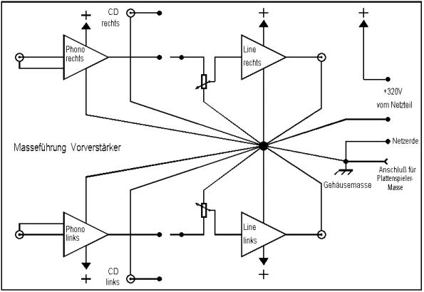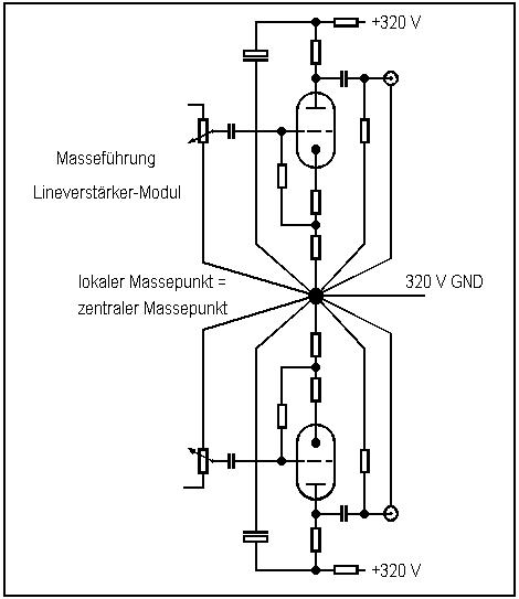 Röhrenschaltungen werden im allgemeinen nicht mit einer symmetrischen (±)Spannungsversorgung betrieben. Der Minuspol der Versorgungsspannung ist normalerweise mit dem Bezugspotential (Masse) verbunden, sodaß der Betriebsstrom der Verstärkerstufen samt überlagertem Wechselstromanteil durch die Masseleitungen fließt. Das ist keine ideale Ausgangsposition für die Vermeidung von Störsignalen. Um gegenseitige Störungen der Stufen untereinander zu vermeiden, sollte also zumindest darauf geachtet werden, daß der Betriebsstrom verschiedener Verstärkerstufen nicht über die gleiche Verbindung führt. Am einfachsten ist das zu erreichen, indem man einen zentralen Massepunkt anlegt, der als Bezugspunkt für alle Signale dient und von dem aus sternförmig alle Versorgungsleitungen abzweigen.
