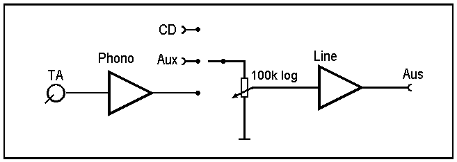 Wie schon angedeutet (1), lag der Schwerpunkt bei diesem Projekt nicht auf dem Bau eines repräsentativen Gehäuses, sondern auf dem Erreichen von vorgegebenen Übertragungseigenschaften. Die vorgegebenen Werte betreffen den Frequenzgang, das Signal/Rausch-Verhältnis bei Schallplattenwiedergabe und bei CD-Wiedergabe und schließlich den Klirrfaktor. Mehr oder weniger frei festgelegt werden kann der Gesamt-Verstärkungsfaktor. Diese Reihenfolge entspricht auch der Bedeutung, die den einzelnen Werten zugemessen wurde. Im einzelnen wurde folgendes angestrebt: