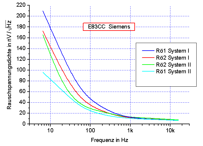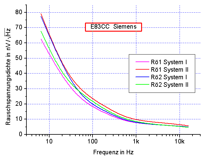 Mit diesen Mitteln konnte der in Bild 2. gezeigte Verlauf der Rauschspannungsdichte für zwei E83CC (Siemens) aufgenommen werden.