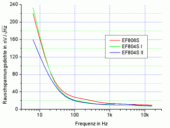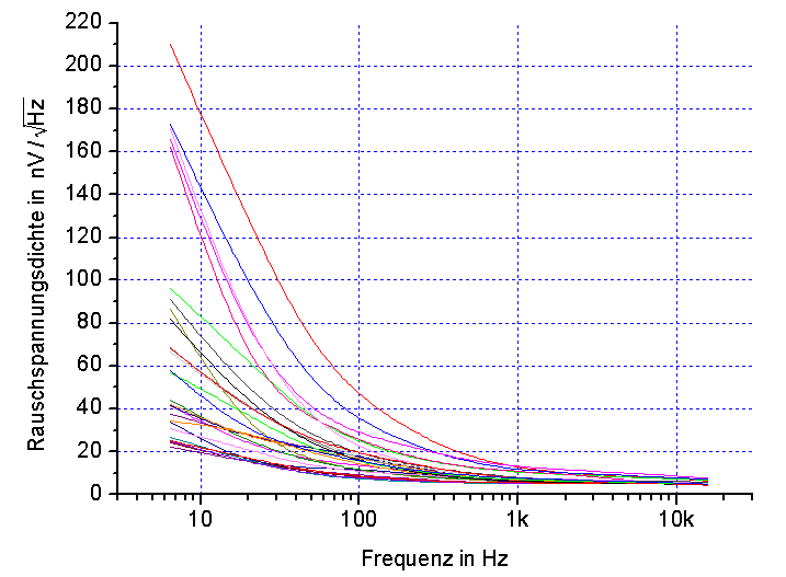 bei Werten deutlich unterhalb von 10. Unterhalb von 1 kHz steigt die Rauschspannungsdichte kontinuierlich mehr oder