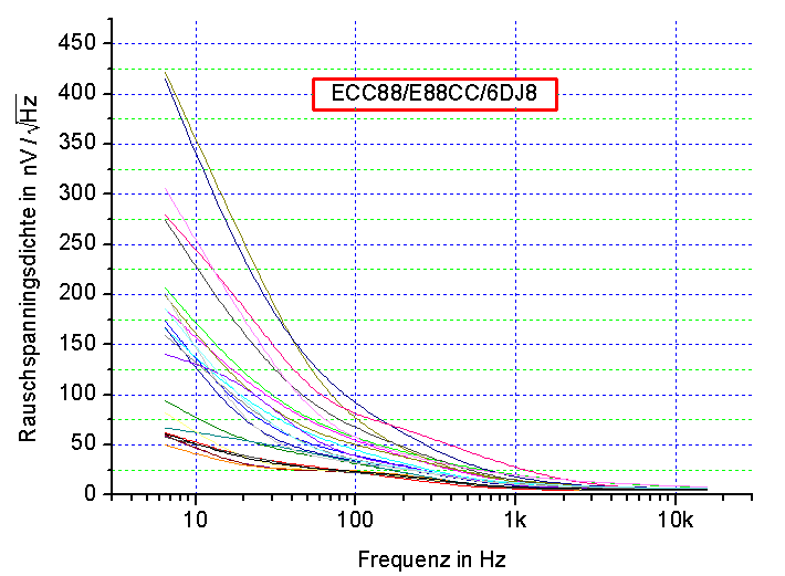 Bild 5. schließlich zeigt die Kurven aller ECC83-Exemplare einschließlich der aus Bild2/3/4, die im ganzen Audio-Bereich vermessen wurden. Man sieht, daß die Streuung der Eigenschaften bei Frequenzen oberhalb von ca. 1 kHz relativ gering ist, im tieffrequenten Bereich (Bereich des 1/f-Rauschens) aber stark zunimmt. s.a. Fußnote 8-3.