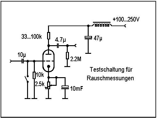 Für die Messungen wurde eine kleine Testschaltung aufgebaut (s. Bild 1.). Die Röhren werden mit gut stabilisierten Gleichspannungen aus externen Netzgeräten versorgt. Die Restwelligkeit der stabilisierten Anodenspannung betrug ca. 1 mVss. Sie mußte durch ein Siebglied mit Drossel weiter herabgesetzt werden, um die Messung der kleinen Rauschspannungen an der Anode, breitbandig ca. 100µV, nicht zu stören.