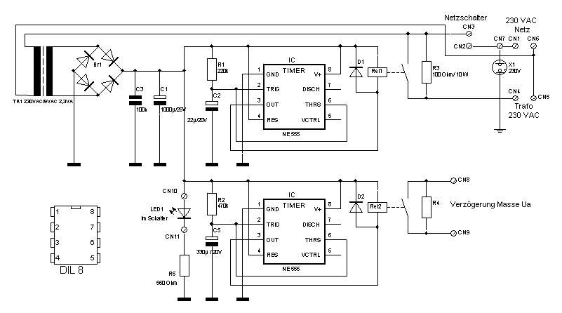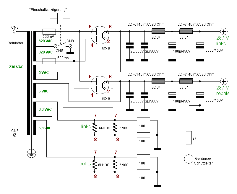 Die Schutzschaltung dient zur Unterdrückung des Einschalt-Stromimpulses und der verzögerten (ca. 1 Minute) Zuschaltung der Anodenspannung.
