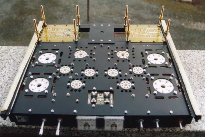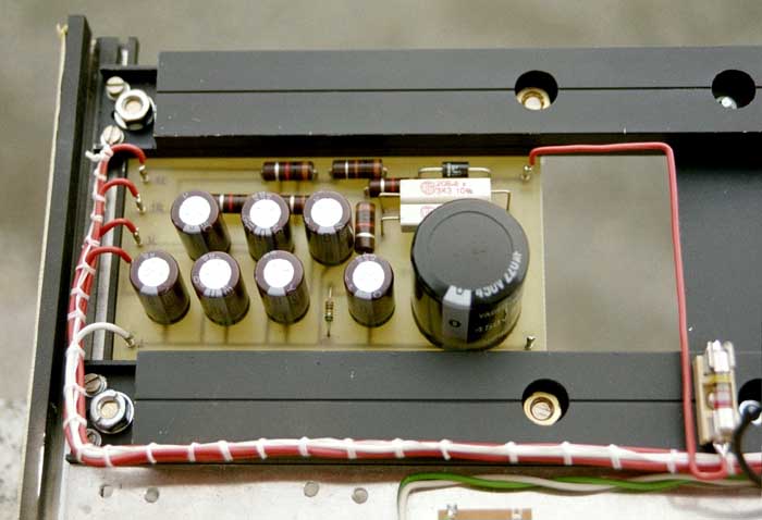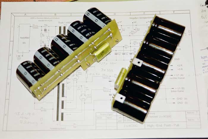 Heizspannungsversorgung der Vorröhren und die beiden Siebblöcke für die Endstufen wurden auf Leiterplatten
