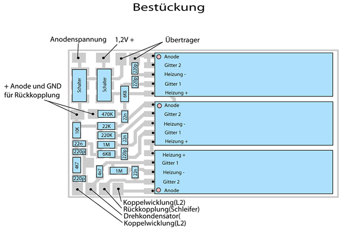 Die erste Röhre arbeitet als Audionsstufe, die Rückkopplung wird durch eine Extrawicklung im Anodenkreis