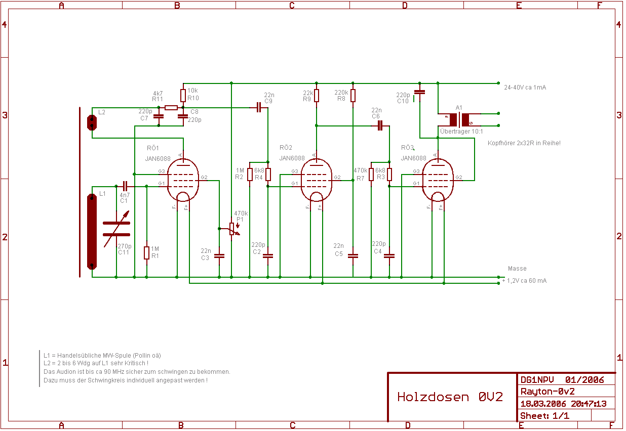 Bei diesem Gerät handelt es sich um einen 0V2 wie er recht häufig anzutreffen ist, die Schaltung lehnt sich sehr an den 0V3 mit 4 x 1sh24b aus der Bastelbude an, da sich die hier eingesetzte JAN6088 bei dieser Beschaltung auch eignet.