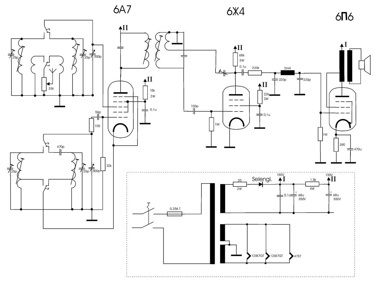 die 6A7 als Mischer, die 6Sch4 als Audion und die 6N6C als Endröhre. Im Netzteil kam, als Tribut an Optik und Nostalgie,